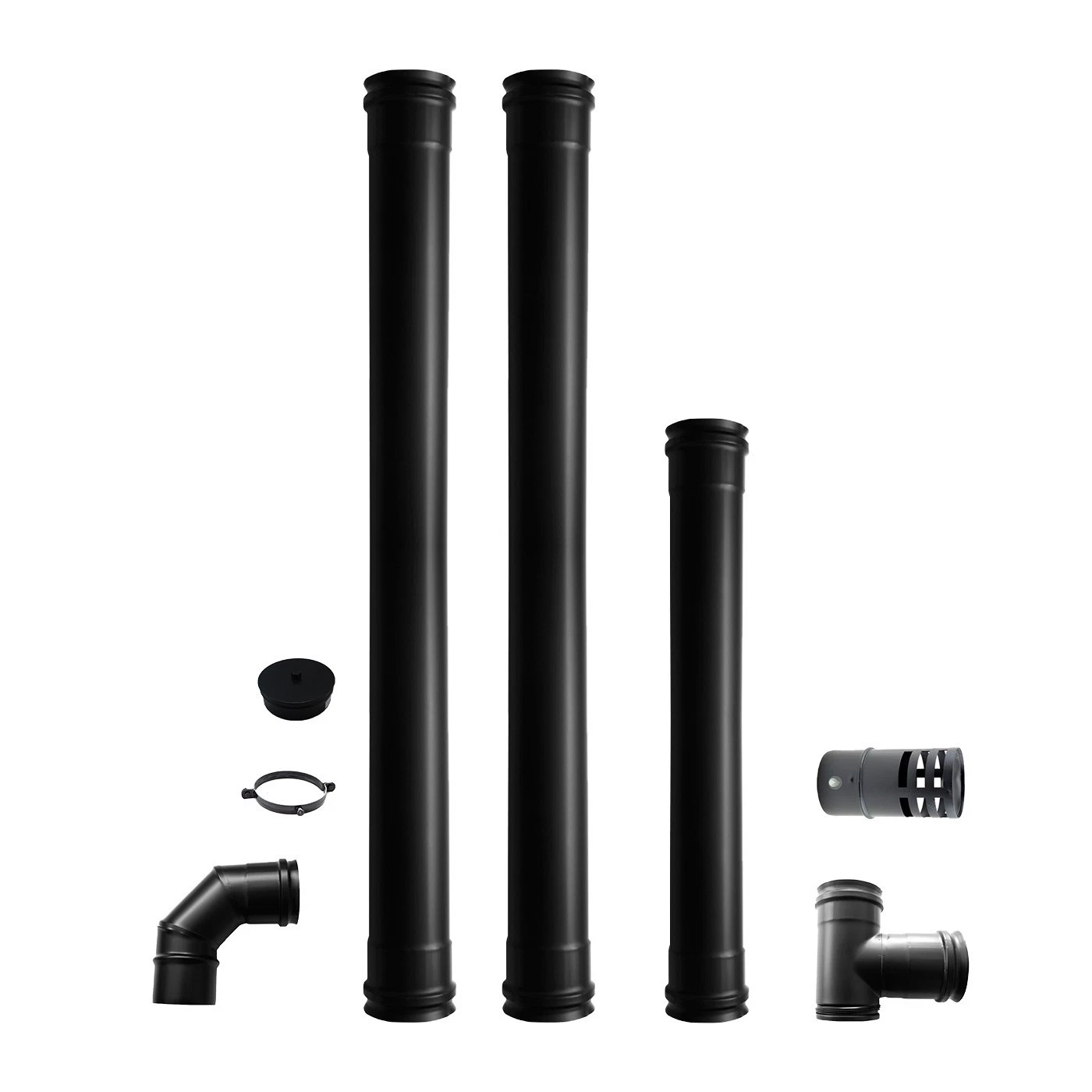 Bestehend aus 2 einfachen Rohrstücken à 1 Meter, 1 einfachen Rohrstück à 0,5 Meter, 1 90°-Bogen, 1 T-Stück, 1 Abdeckkappe, 1 Wandblende, 5 Dichtungen und 1 Wandhalterung. Maße: 80 mm Durchmesser, 1,2 mm Wandstärke.