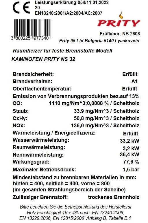 Brennstoffart: Trockenes Holz (≤20 % Feuchtigkeitsgehalt)