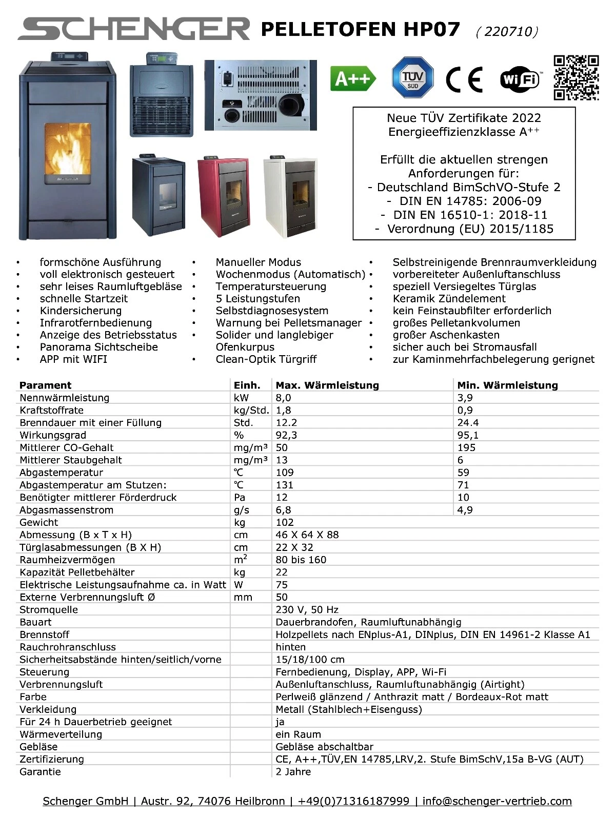 SCHENGER Pelletofen HP07 8,0kW A++ Vollautomatisch+WIFI+ECO+TIMER