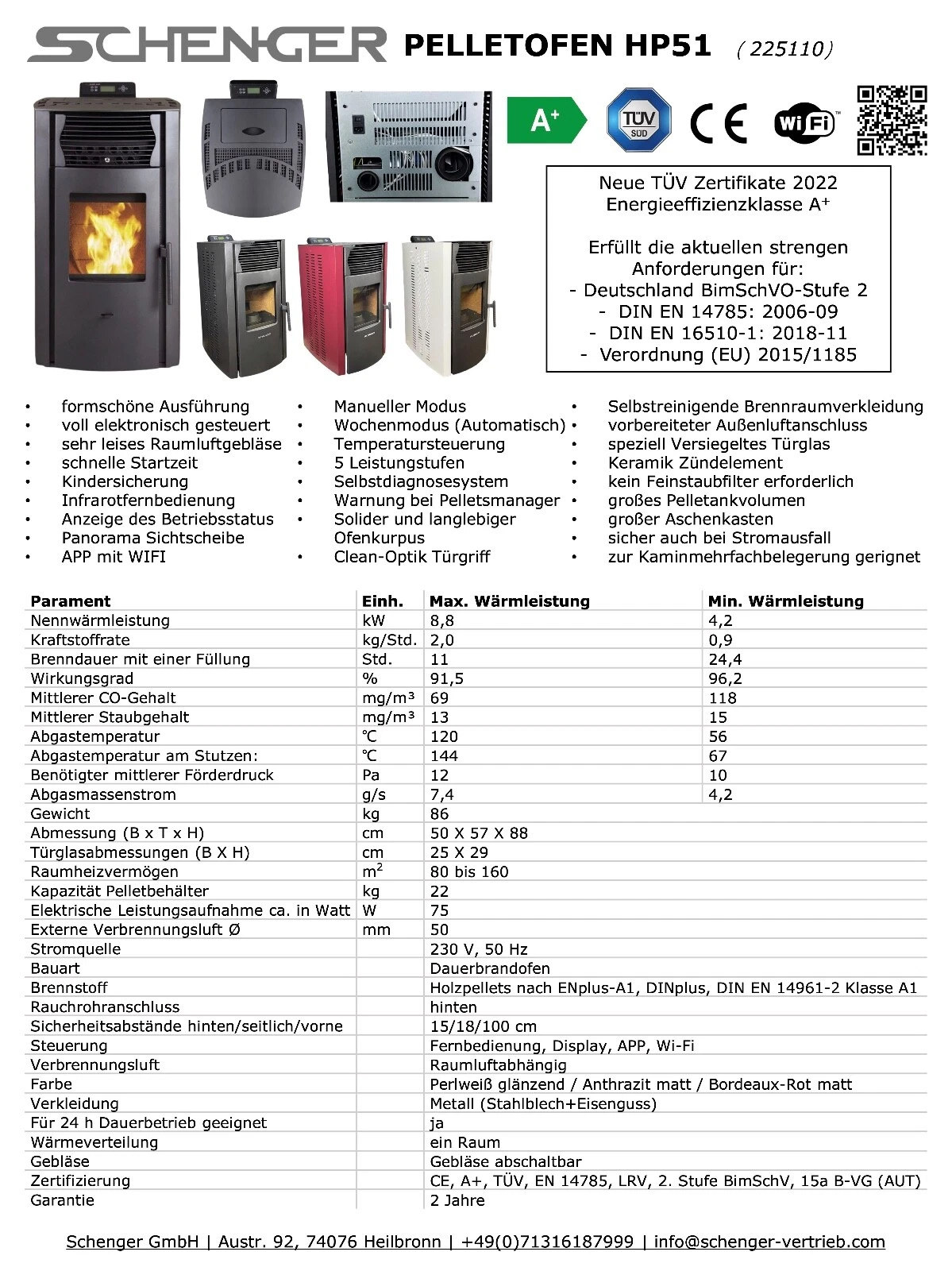 SCHENGER Pelletofen HP51 A+ 8,8kW Vollautomatisch+WIFI+ECO+TIMER